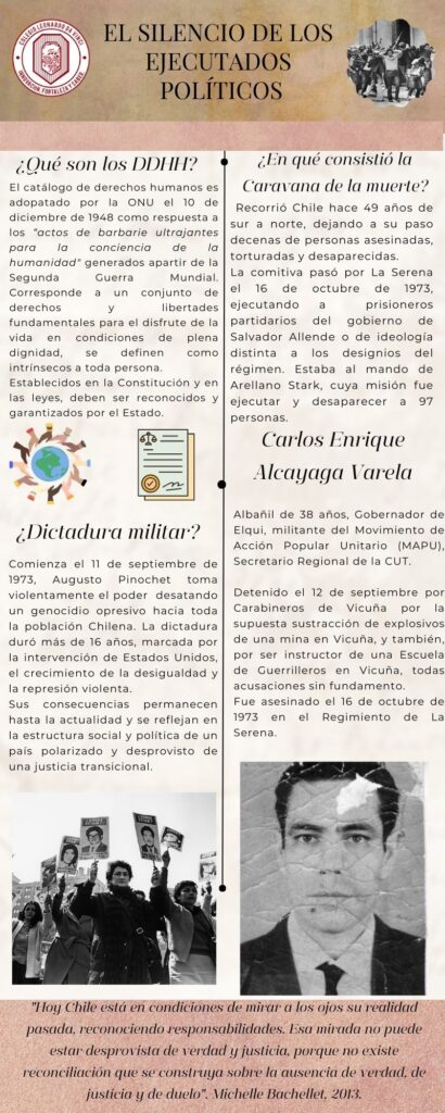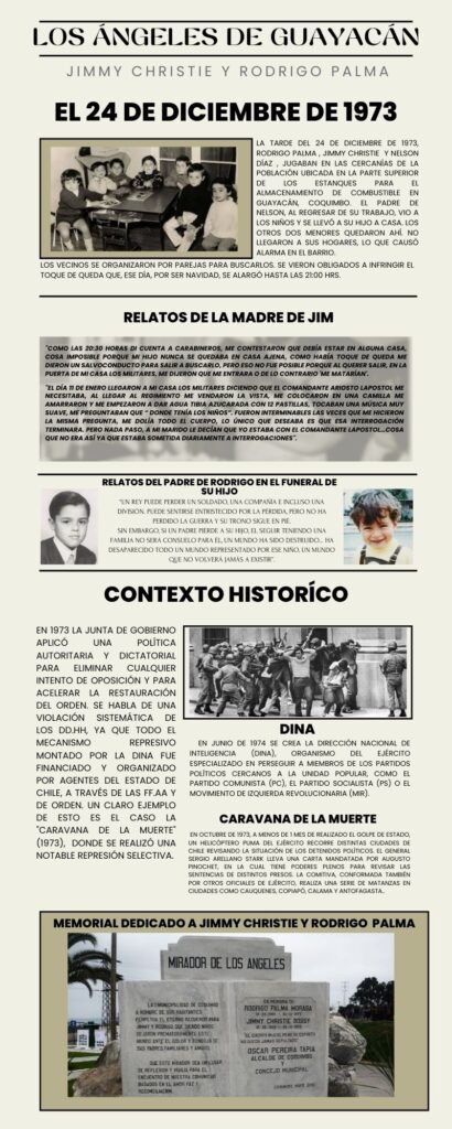 Luego de la investigación, las y los estudiantes diseñaron sus propias infografías para comunicar diversos casos sobre violacones a los derechos humanos, centrándose en casos regionales como, por ejemplo, el paso de la Caravana de la Muerte por la Región de Coquimbo.